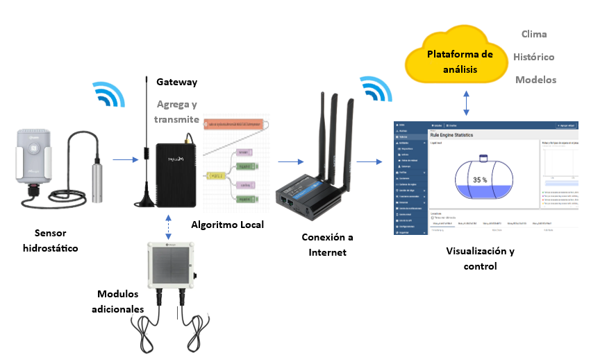 Sensores de nivel precisos · Gateway local · Lógica CWD embebida · Control riesgos potenciales sin cloud obligatorio.