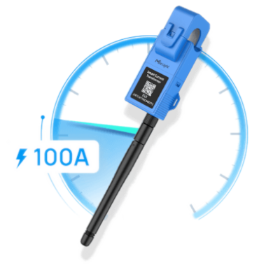 Pinza CT no invasiva mide corriente RMS hasta 100A (resolución 1mA, precisión ±1% >5A), calcula Ah acumulados y temperatura NTC (-20°C a 100°C). Se autoalimenta del cable medido (o USB-C), sin baterías.