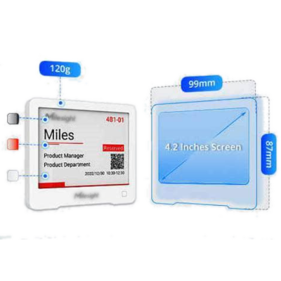 Pantalla E-Ink 4.2″ tricolor (negro/blanco/rojo) de 400×300 píxeles (119 DPI), visible 180° incluso bajo sol directo. Muestra texto en 150 idiomas, imágenes, QR o plantillas personalizadas (hot desk, precios dinámicos).
